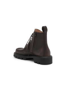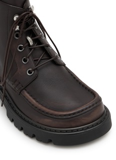 Step into the autumn season with Loewe's robust and stylish dark brown leather boots. Expertly crafted from supple leather, these boots offer both durability and a smooth, refined finish. The design features classic lace-up fronts and detailed stitching, embodying timeless style with a contemporary edge. Set on a thick, treaded rubber sole, they provide excellent traction and support, ideal for varied terrains. The pull tab at the back ensures ease of wear.