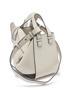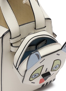 Brighten your look with LOEWE’s iconic Hammock Bag, reimagined with a charming dog face in soft pastels and bold lines. This white leather piece blends artistic whimsy with the brand’s signature geometric design, making it a standout accessory for the modern trendsetter.