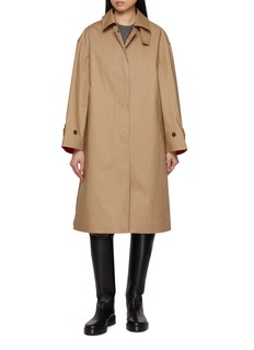 Master the art of transitional dressing with Mackintosh's timeless beige trench coat. Crafted with precision, this coat features adjustable cuff straps and a contrasting interior collar for a subtle pop of color. The clean lines and neutral shade ensure it pairs seamlessly with any ensemble, making it an essential piece for any sophisticated wardrobe.