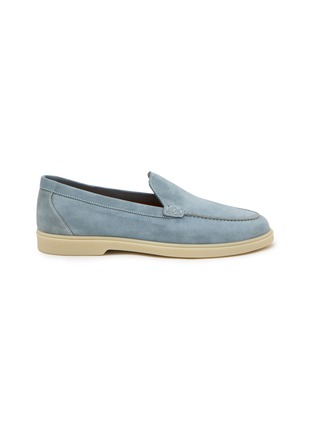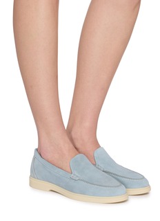 Rendered in velvety suede, the Sophie loafers trace a clean, elongated silhouette with a stitched apron toe and softly structured vamp. Finished with a cushioned rubber sole, this pair balances lightness and polish—an effortless companion to tailored trousers or fluid summer dresses.