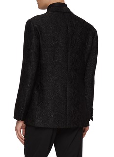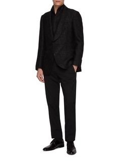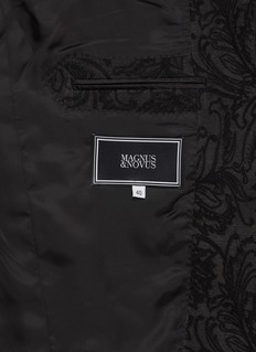 This blazer by Magnus & Novus elevates formalwear with intricate floral embroidery woven into a lustrous jacquard blend. With its sculpted shawl lapel and subtly textured surface, the piece balances artistic craftsmanship and timeless sophistication for evening refinement.