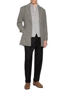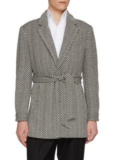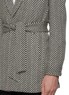 Woven from pure wool, this Magnus & Novus coat features a striking monochrome herringbone pattern that merges classic tailoring with sculptural finesse. The belted silhouette and peak lapels refine its architectural lines, making it a statement of confident modern elegance.