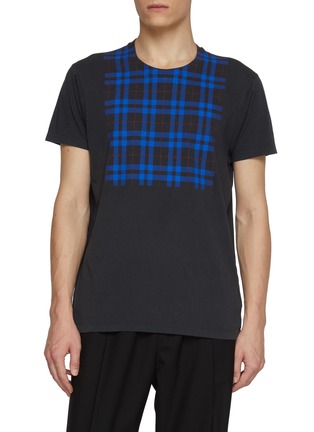 Maison Margiela's T-shirt embodies the brand's deconstructive approach to casualwear, merging minimalist construction with bold graphic expression. Crafted from soft cotton jersey, this piece features a classic crewneck design alongside a striking blue-and-red checkered bib panel, creating a deliberate contrast between understated fabric and vibrant pattern.