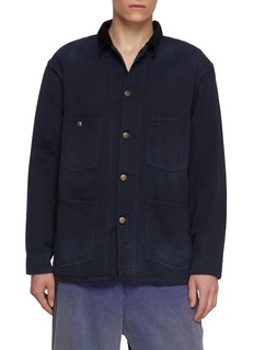 Maison Margiela reimagines the classic work jacket through refined tailoring and textural contrast. Cut from cotton herringbone, this piece features a tactile corduroy collar and utilitarian pockets for functionality. Style it over a crisp shirt or knitwear to elevate casual ensembles.