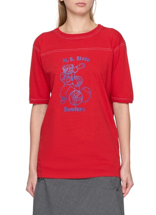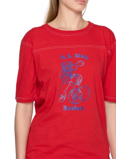 Channeling a lived-in Americana mood, this cotton T-shirt captures Maison Margiela’s archival sensibility through a collegiate sports graphic and visible contrast stitching. Relaxed in spirit yet intentional in detail, it lends effortless character to tailored skirts or layered denim looks.