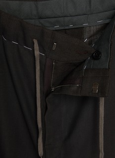 Maison Margiela redefines tailoring with these drawstring trousers in lightweight fresco wool. The relaxed straight-leg silhouette balances ease and refinement, while contrast topstitching at the waistband evokes the house’s artisanal deconstruction. Pair with crisp shirting for understated elegance.