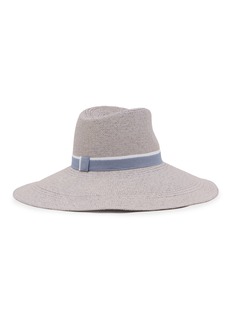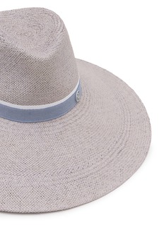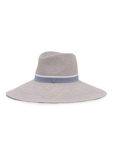 Maison Michel presents a wide-brimmed sun hat with woven construction and contrasting grosgrain ribbon adorned with signature logo emblem for refined resort elegance. The dramatic silhouette with generous brim and structured crown delivers sophisticated sun protection, while tonal trim detailing and iconic monogram create a statement accessory for elevated vacation styling with Parisian millinery heritage and effortless glamour.
