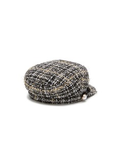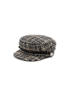 This Maison Michel hat artfully combines timeless elegance with a touch of modern flair. Featuring a classic tweed construction in a chic black and white palette, the hat is adorned with frayed edges for a contemporary twist. A subtle yet striking pearl detail on the band adds a luxurious element, making it a perfect accessory for enhancing both casual and formal ensembles.
