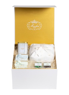 Marchesi 1824 offers elegant boxes containing the most iconic Christmas products. This box contains the classic 1kg Panettone, a box of assorted cremini, a box of assorted pralines, a cube of coffee-flavoured Dragée, a cube of sugar-free gianduiotti and a tin containing the dark hot chocolate preparation.