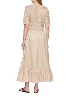 Merlette’s mastery of craft is evident in the intricately hand-smocked bodice of this dress, creating sculptural texture that melts into a fluid, tiered skirt. The cotton-silk blend lends a gentle sheen and softness, offering an elevated ease suited to both quiet moments and refined gatherings.