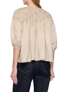 Intricate hand-smocking defines the neckline and shoulders of this blouse, revealing Merlette’s devotion to artisanal craft. Its voluminous sleeves and fluid drape create a sculpted yet effortless silhouette—an elevated everyday piece that pairs seamlessly with denim or tailored separates.