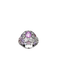 This stunning ring is a dazzling celebration of luxury and colour. At its heart lies a radiant pink sapphire, surrounded by a breathtaking array of diamonds. The intricate design showcases a harmonious blend of geometric shapes and sparkling gemstones, creating a captivating play of light and colour.