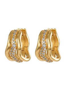 A statement of sculptural grace, these triple hoops evoke molten gold captured mid-flow. The centre band glimmers with pavé-set crystals, recalling frost kissed by sunlight. Bold yet refined, they lend dimensional shine to any look — perfect from dawn to after-dark.