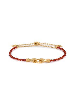 From the Missoma X Harris Reed collaborative collection, this bracelet unites symbolism and statement design. Faceted red gemstones frame sculptural gold vermeil hands clasping at centre, while a delicate slider chain ensures a bespoke fit—an expressive accent for both stacked edits and standalone wear.