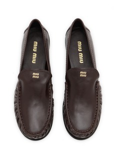 Step into sophistication with these Miu Miu loafers, expertly crafted from luxurious dark brown leather. The design features a classic loafer silhouette with a modern twist, showcasing an elegant ruched detailing across the vamp. These loafers are perfect for a polished look, offering both comfort and style.