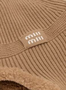 Wrap yourself in warmth and luxury with Miu Miu's ribbed knit pilot hat, designed in a sophisticated taupe hue. This beautifully crafted accessory features a soft sherpa lining that offers extra insulation and comfort during the cold months.