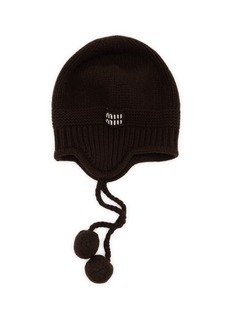 Embrace the colder months in style with Miu Miu's classic knit beanie, crafted from luxurious yarns in a deep chocolate hue. This charming hat features playful pom-pom ties and a snug fit that ensures warmth and comfort. The distinctive Miu Miu logo detail adds a touch of designer flair, making it a fashionable yet functional accessory for any winter ensemble.