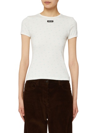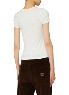 Delicate yet deliberate, this ribbed T-shirt reveals Miu Miu’s softer codes through an all-over floral micro print. Finished with scalloped trims and a subtle logo tab, the fitted silhouette lends a romantic undercurrent—perfect layered beneath tailoring or worn solo with denim.