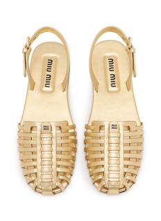 Miu Miu's sandals feature metallic, intersecting straps with a buckled back strap. The design combines texture with a polished gold-toned finish for effortless summer sophistication. A versatile warm-weather staple that elevates casual and dressy looks alike.