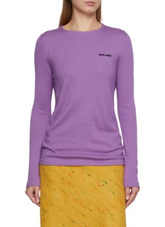 Add a dash of colour to your everyday attire with this knit T-shirt. Its vibrant purple hue and logo intarsia offer a luxurious twist on a classic wardrobe staple, perfect for pairing with sleek skirts and loafers for the classic Miu Miu look.
