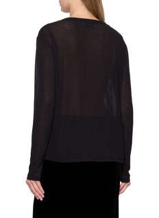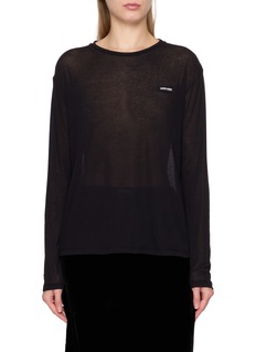 A study in lightness and restraint, this Miu Miu top is cut from airy jersey with a translucent finish that softly traces the body. The pared-back silhouette invites playful layering—style over a bralette or slip dress for gallery days, evening walks, or understated after-dark moments.