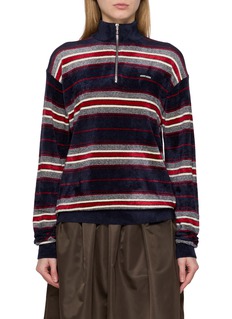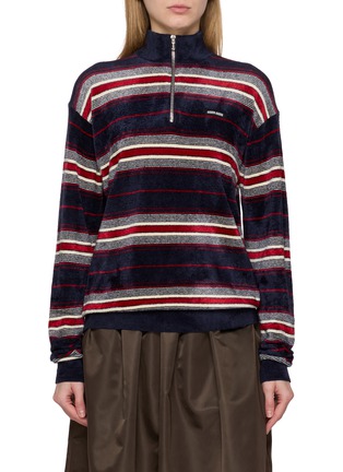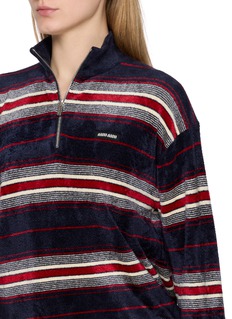 Soft-focus texture meets graphic precision in this long-sleeve top, where plush velour stripes bring depth to a sporty silhouette. Finished with a zip-front stand collar, the design channels Miu Miu’s retro-athletic codes—ideal for pairing with fluid skirts or tailored trousers for off-duty polish.
