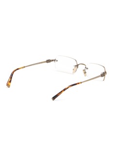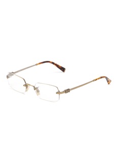 These Miu Miu glasses epitomize minimalist elegance with their rimless, rectangular design and delicate gold-tone detailing. The sleek metal arms are accented with tortoiseshell tips, adding a sophisticated touch. Perfect for those who value understated luxury, these glasses provide both functionality and style, enhancing any professional or casual look with ease.