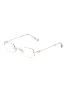 Embrace minimalist elegance with these Miu Miu optical glasses. Their rimless, rectangular design and slender silver-tone arms offer a sleek, sophisticated look. Detailed with subtle engravings on the hinges, these glasses are perfect for those who appreciate understated luxury and style. Ideal for adding a polished touch to any professional or casual ensemble, they blend functionality with a modern aesthetic.