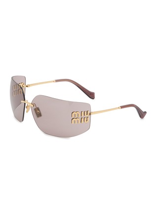 These Miu Miu sunglasses are the epitome of sleek sophistication, featuring a rimless design and muted grey lenses for a contemporary aesthetic. The gold-tone hardware and distinct Miu Miu logo detailing on the temples enhance their luxury appeal. Perfect for fashion enthusiasts seeking a modern yet timeless accessory, these sunglasses provide both impeccable style and UV protection. Ideal for elevating everyday outfits or complementing a chic, refined look.