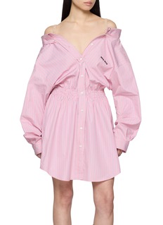 A classic shirt silhouette is reimagined through a playful, deconstructed lens in this piece from Miu Miu. Cut from striped popeline with a soft wool blend, the off-shoulder neckline and smocked waist create contrast between ease and structure—perfect for statement daywear or layered evening styling.