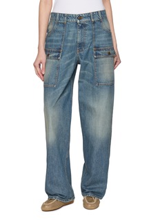These Miu Miu jeans exude a stylish utilitarian charm, perfect for the modern fashion enthusiast. The design features multiple pockets that not only add a practical element but also enhance the visual appeal with a nod to vintage workwear styles. The relaxed fit ensures comfort without compromising on style, making these jeans ideal for everyday wear.