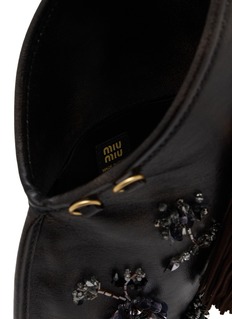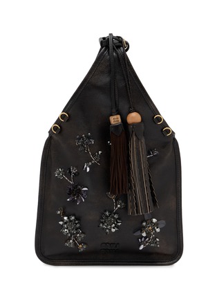 Miu Miu's embellished tote bag combines bohemian charm with refined luxury through intricate crystal and sequin floral appliqués. The slouchy silhouette features drawstring top closure, dual leather tassels with branded detail and wooden bead, metal eyelet accents, structured base, and signature logo embossing. Playful sophistication meets artisanal craftsmanship.