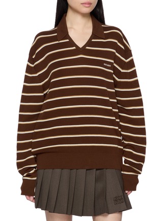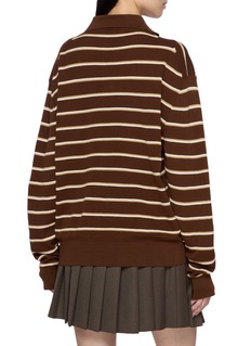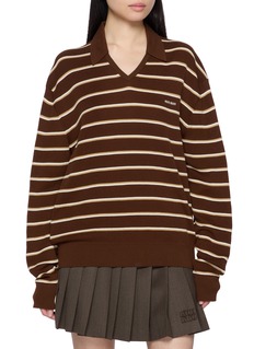 Miu Miu's relaxed polo sweater reinterprets preppy codes with bold horizontal stripes and an oversized silhouette. The classic collar and ribbed trims ground the design, while the embroidered logo adds subtle brand recognition.