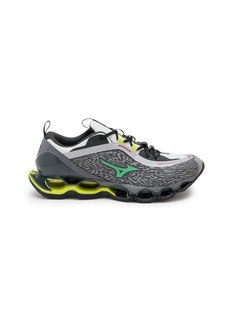 Mizuno's Wave Prophecy running sneakers showcase the Japanese brand's pioneering cushioning technology with a distinctive wave-plate midsole featuring exposed articulated pods for maximum shock absorption. The textured upper with signature Runbird logo and speed-lacing system delivers dynamic support, while rear pull-tabs ensure easy on-off functionality.