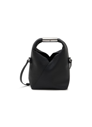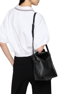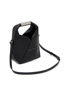 Step into the realm of refined minimalism with the MM6 Maison Margiela black leather bucket bag. This elegant accessory is crafted from premium black leather, featuring a distinctive bucket silhouette that merges classic style with modern sensibility. The polished silver-toned metal handle and adjustable shoulder strap offer versatile carrying options, ensuring comfort and functionality.