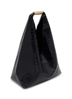 Embrace the essence of modern luxury with the MM6 Maison Margiela Croc-Embossed Triangle Tote. This striking piece features a bold, architectural design with a crocodile-embossed finish, offering a tactile and visual feast. The gold-tone bar handle adds a refined touch, making this bag both a functional carryall and a statement of high fashion.
