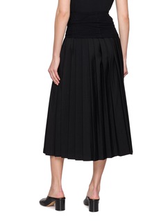 This MM6 pleated midi skirt embodies modern elegance with its fluid design and classic black hue. Crafted from a lightweight fabric that offers both comfort and a flattering drape, this skirt features precise pleating for a sophisticated, textured look. The high-rise waistband ensures a seamless fit, making it perfect for pairing with both cropped tops and tucked-in blouses.