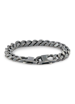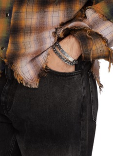 Defined by weight, rhythm and restraint, this MM6 Maison Margiela bracelet channels utilitarian codes through a refined curb-chain silhouette. Subtly engraved with the house’s numeric emblem at the clasp, it delivers a quiet statement—designed to ground fluid tailoring or add edge to everyday layers.