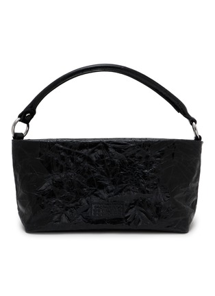 MM6 Maison Margiela's shoulder bag showcases the label's signature deconstructed aesthetic with crinkled texture and raw-edge detailing. The compact silhouette features single top handle with ring hardware, tonal embossed logo patch at front, magnetic closure, and slouchy unstructured form. Understated rebellion meets everyday versatility.