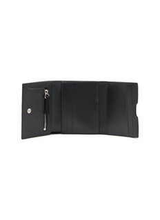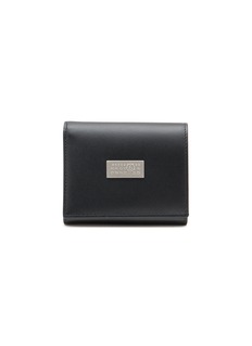 The MM6 Maison Margiela wallet is a refined accessory crafted from premium black leather, designed for the discerning individual. Its sleek silhouette is accented with a unique silver-toned plaque featuring the label's signature numerical logo, adding an avant-garde touch. This wallet not only looks sophisticated but also organizes essentials effortlessly with its ample card slots and compartments.