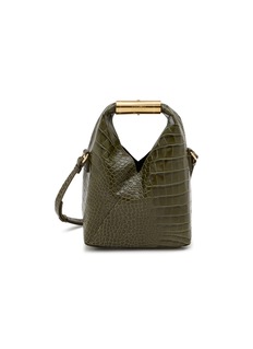 Step into a world of avant-garde elegance with the MM6 Maison Margiela Croc-Embossed Crossbody Bag. This captivating accessory is expertly crafted with a crocodile-embossed exterior in a rich olive green, offering a luxurious texture and an edgy aesthetic. The innovative bucket design is both spacious and stylish, featuring a unique gold-tone bar handle that adds a modern twist.