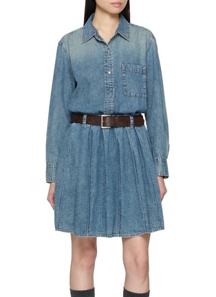 MO&CO. - Belted Pleated Medium Wash Denim Dress