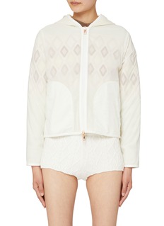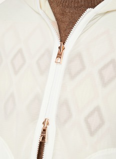 Moncler redefines winter warmth through considered material contrasts, achieving an elegant yet functional balance. This knit jacket in a soft beige base carries a subtle diamond-stitch pattern that lightens the silhouette. A dual-zip closure ensures a tailored feel, completing a look of refined and relaxed winter sophistication.