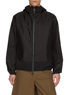 Moncler's hooded windbreaker combines technical performance with streamlined design through its lightweight shell construction. The two-way zip closure and adjustable hood offer versatile weather protection, while elasticated cuffs ensure a secure fit. Essential outerwear that embodies the brand's Alpine heritage and urban functionality.