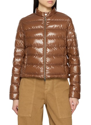 Defined by a high-shine surface, this zip-up jacket from Moncler brings a polished edge to classic padded construction. Cut in a streamlined silhouette with a stand collar, it offers a refined approach to cold-weather dressing, suited to both urban layering and off-duty wear.