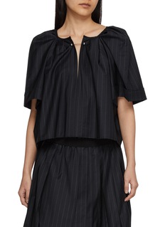 A lighter expression of Nackiyé’s iconic Grand Bazaar silhouette, this top introduces short sleeves while preserving its sculptural identity. Fine pinstripes trace the fluid drape, framed by shawl shoulders, raw-edged finishes and the signature double pearl neck pin—refined yet expressive.