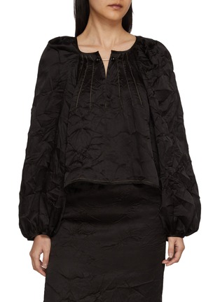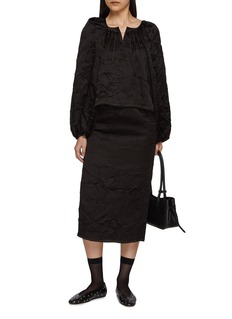 A signature silhouette reworked in a more compact form, this mini top channels Nackiyé’s Grand Bazaar spirit through sculptural shawl shoulders and crinkled texture. Finished with raw edges and the house’s double pearl neck pin, it brings artisanal drama to evening or elevated daytime looks.