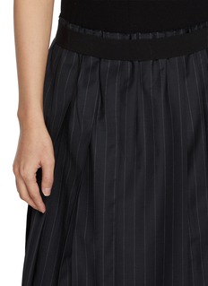 Borrowing from classic school uniform codes, this skirt reinterprets pleating through an asymmetrical lens. Fine pinstripes accentuate the rhythmic play of narrow-to-wide pleats, while the subtly longer left side adds movement—an intelligent balance of structure and softness for modern tailoring moments.