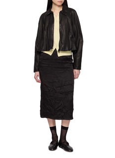 A sculptural study in proportion, this lamb leather jacket by Nackiyé is cut with a cropped, fluid silhouette that moves softly against the body. Finished with a subtle back panel detail, it layers effortlessly over dresses or tailored separates for an elevated day-to-night attitude.