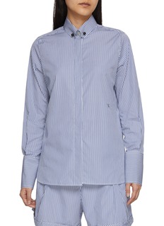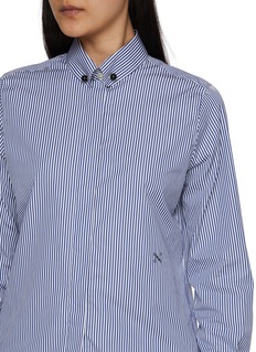 A refined reinterpretation of classic shirting, this cotton shirt balances precision with ease. Woven from Thomas Mason fabric, fine stripes run cleanly through the body, while the rounded collar and concealed buttons deliver a quietly polished finish—ideal worn loose over shorts or tucked into tailored separates.